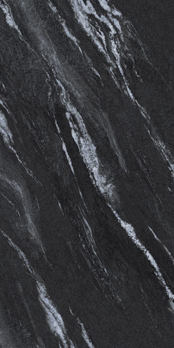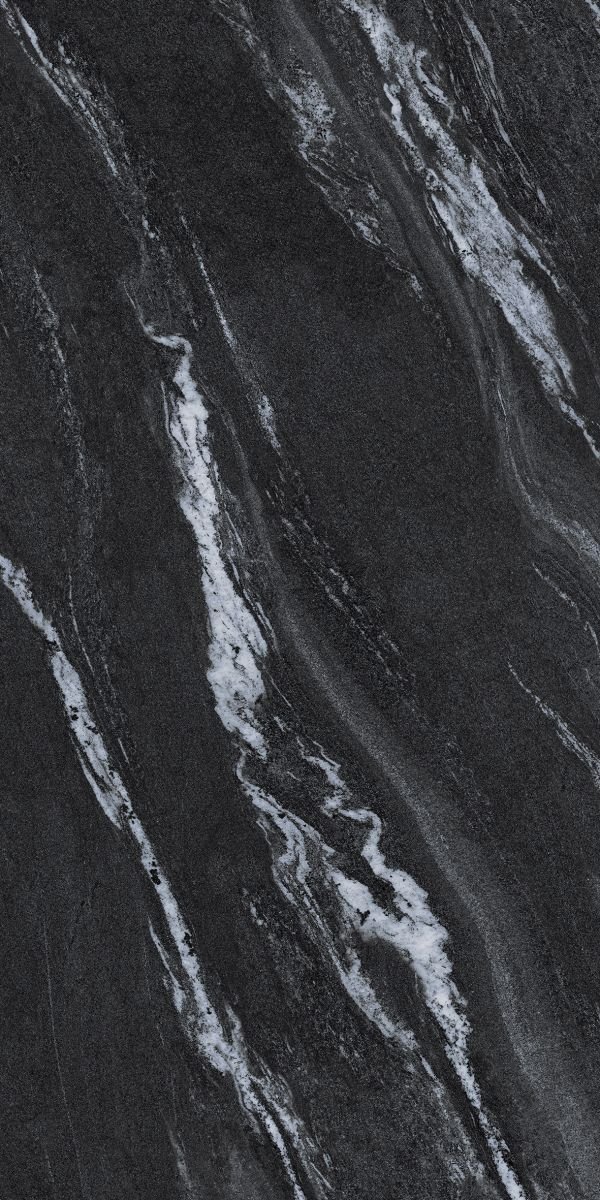 Nero Striato Quartzite is a bold ceramic slab inspired by the rugged beauty of Italian black quartzite and granite. The surface showcases deep charcoal tones layered with striking white mineral streaks that flow diagonally, creating a sense of movement and natural depth.